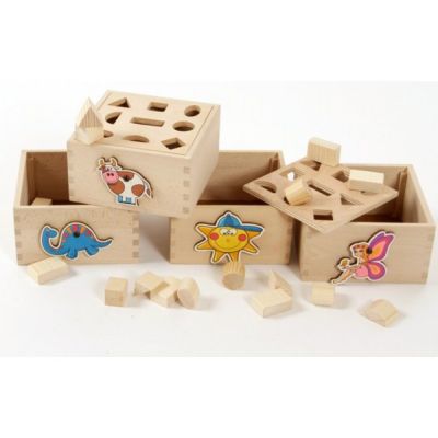 DIDAKTICKÁ buková krabička má horní odnímatelné víko, ve kterém jsou otvory různých tvarů. Součástí hračky je 9ks dřevěných tvarů (špalíčků), které si děti do víka vkládají. Na přední části krabičky je umístěn barevný obrázek na dřevěném podkladu - sluníčko, kravička, dinosaurus, víla. Obrázek je ve středu připevněn ke krabičce a děti jím mohou otáček dokola. Didaktická hračka pomáhá rozvíjet motorické schopnosti. Veškeré materiály jsou testovány podle přísných norem, jsou vhodné pro děti od 1 roku.