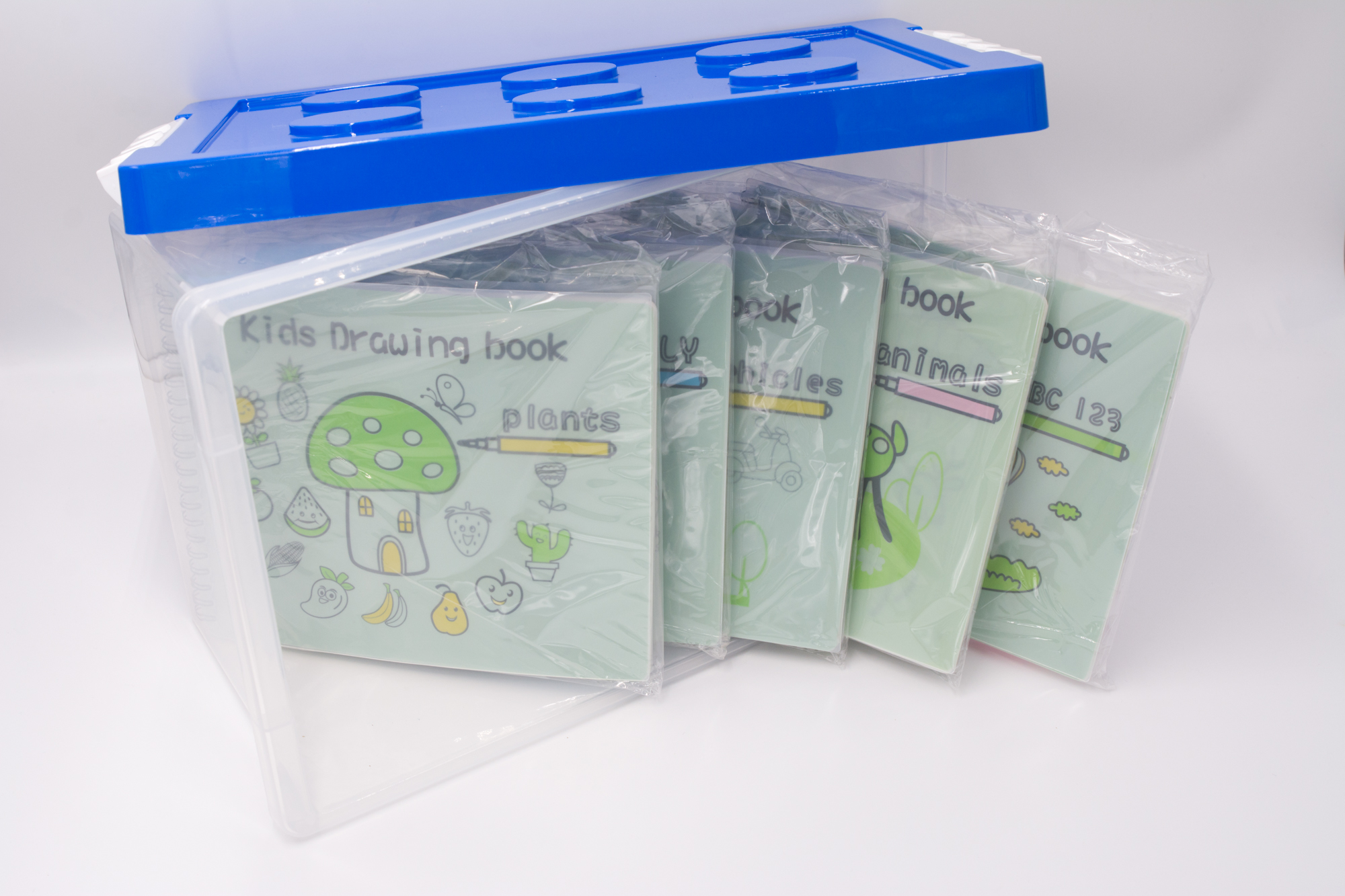 Plastový box s 5 stíratelnými silikonovými knihami omalovánek na téma: ZVÍŘÁTKA, ROSTLINY, DOPRAVNÍ PROSTŘEDKY, RODINA a ABC 123. Kniha je vyrobena z potravinářského silikonu, zdravotně nezávadná.