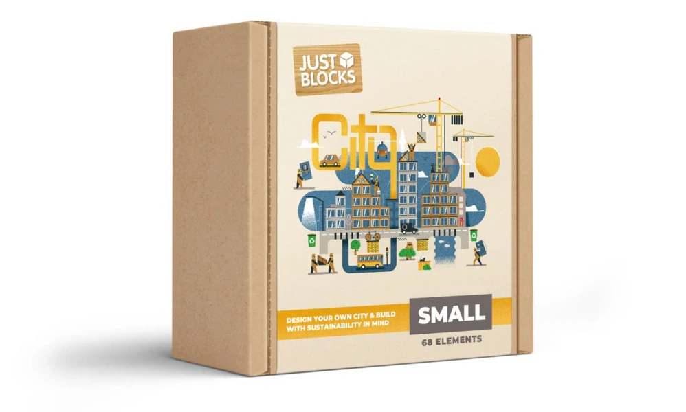 Díky moderním kostkám ve 4 tvarech s podmanivým tištěným designem si děti mohou vybrat z 34 jedinečných funky grafik, včetně jízdních kol, odpadkových košů a nabíječek na elektrická auta. Sada je zdobena zelení, zvířaty a veselými obyvateli a zvou děti, aby se ponořily do pulzujícího městského života.